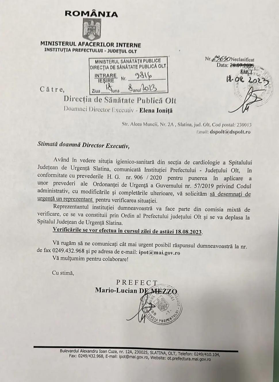 Prefectul județului Olt, Mario De Mezzo, a trimis o solicitare către DSP pe care era trecută o dată anterioară numirii sale în funcție. Explicația politicianului