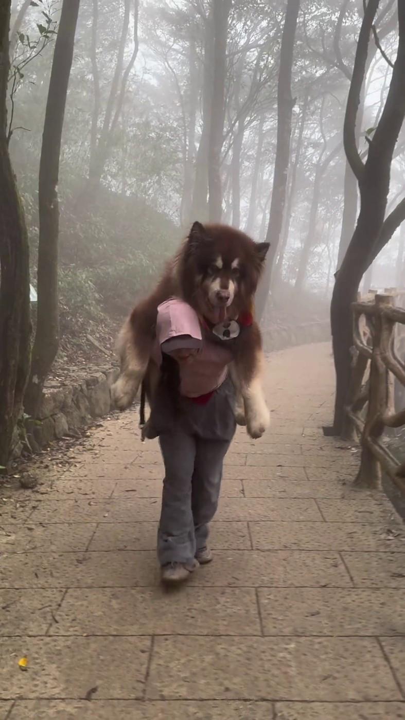 Un malamut uriaș și leneș scos la plimbare n-a mai avut chef să meargă, iar stăpâna l-a cărat în spate. Câinele are 49 kg