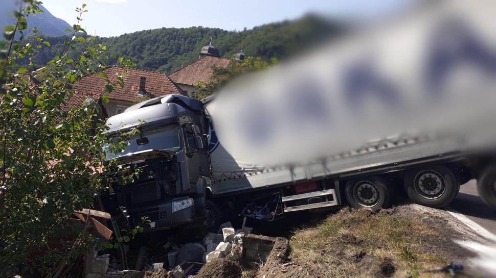Un localnic din Călineşti, judeţul Vâlcea, s-a trezit cu un TIR în curte. Remorca autotrenului a rămas suspendată, iar traficul a fost îngreunat în zonă