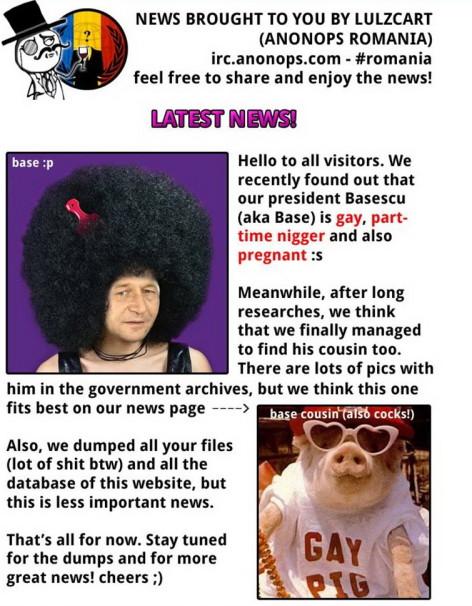 "Salutări tuturor vizitatorilor. Am descoperit de curând că preşedintele Băsescu (aka Base) e gay, pe jumătate persoană de culoare şi însărcinat", au scris hackerii AnonOps Romania, care au postat pe site şi o fotografie prelucrată în Photoshop cu preşedintele României.