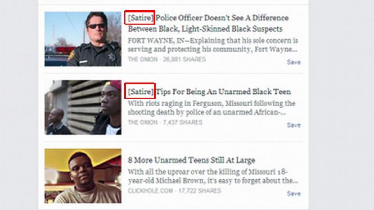 Facebook testează în prezent introducerea etichetei "satiră" în faţa link-urilor care trimit la acele site-uri care s-au specializat în publicarea unor articole false, care sunt prezentate însă în mod serios, precum Le Gorafi din Franţa şi The Onion din Statele Unite.