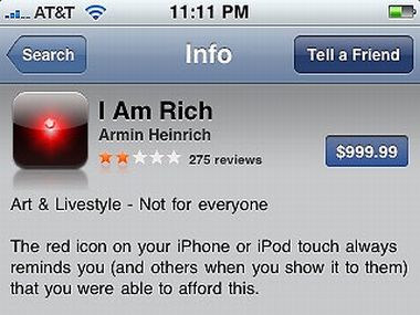 Descrierea oficială a softului "I Am Rich" sună cam aşa: "Icoana roşie de pe afişajul iPhone sau iPod Touch îţi reaminteşte tot timpul (şi altora, atunci când le-o arăţi) că tu îţi permiţi acest lucru. Este o operă de artă cu niciun fel de funcţie ascunsă".