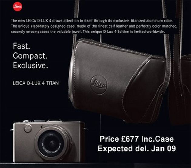 Leica va lansa în ianuarie 2009 camera digitală în ediţie limitată, D-Lux TITAN. Aparatul va veni cu "haine" exclusive din titan şi aluminiu. Bazat pe Lumix LX3 de la Panasonic, Leica D-Lux 4 dispune de un senzor CCD de 10 megapixeli, lentile wide LEICA DC VARIO-SUMMICRON, procesor de imagine Venus Engine IV, Mega OIS, Face Detection şi ISO inteligent. Vor fi disponibile doar 500 de unităţi Leica D-Lux 4 TITAN. Preţul anunţat pentru cameră este de aproximativ 770 de euro.