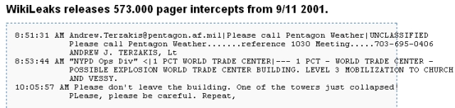 Un mesaj trimis la ora 08.53, care aparţine poliţiei din New York: "Posibiă explozie la World Trade Center. Nivel 3 de mobilizare".