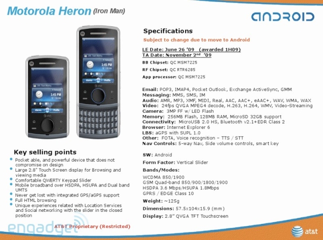 Motorola Heron suportă reţelele dual-band WCDMA/HSDPA şi quad-band GSM. Inima slilder-ului este reprezentată de un procesor Qualcomm MSM7225, are o memorie RAM de 128MB şi 256MB flash. Telefonul suportă carduri microSD/SDHC de până la 32GB.