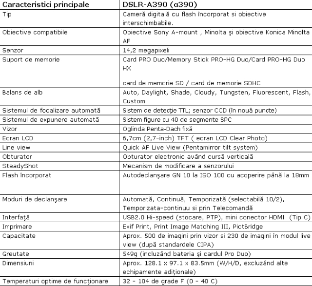 Ambele camere foto au o rezoluţie de 14,2 megapixeli şi o greutate de 456 de grame (fără a include bateria şi suportul media). Modelul α390 beneficiază în plus de funcţia Quick AF Live View, sistem de previzualizare în timp real pe un ecran rabatabil LCD Clear Photo.