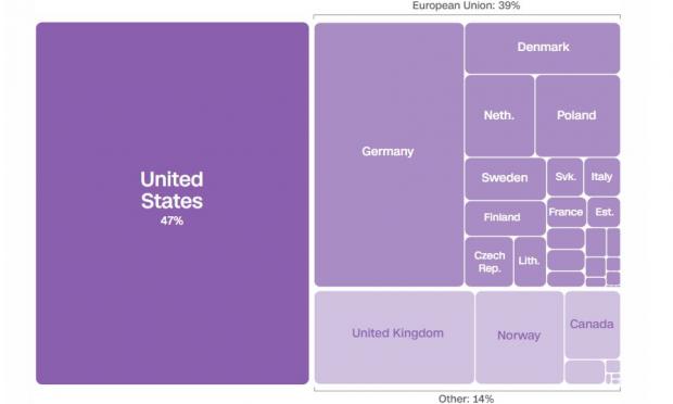 Circa jumătate din această sumă provine din Statele Unite, potrivit datelor Institutului Kiel pentru Economie Mondială, citate de CNN.