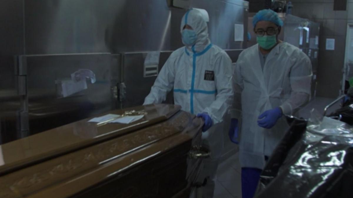 După ce sacul este pus în sicriu, capacul este bătut în cuie și pulverizat cu dezinfectant. Morții de COVID nu au parte de o slujbă ceremonială.