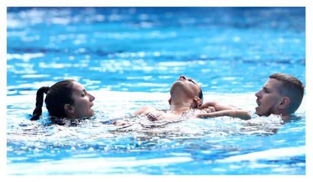Fuentes, de patru ori medaliat olimpic la înot sincronizat, a ridicat-o pe Alvarez la suprafață înainte de a o ajuta să ajungă la marginea piscinei.