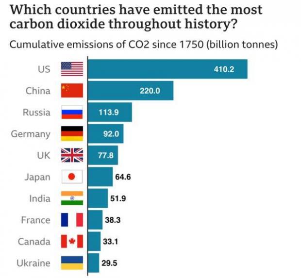Chiar dacă în prezent China este cel mai mare poluator cu dioxid de carbon, la scară istorică SUA se detașează drept lider.