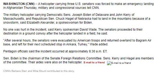 Motivul aterizării forțate: o furtună de zăpadă. La bordul aparatului se aflau Joe Biden, senator democrat din statul Delaware, viitor președinte al Statelor Unite, John Kerry, senator democrat de Massachusetts și Chuck Hagel, senator republican din statul Nebraska.
