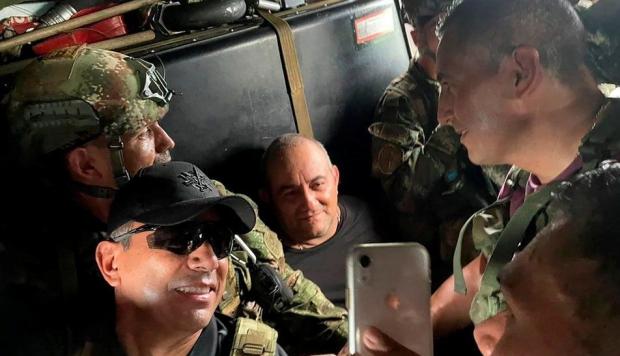 Dairo Antonio Usuga (foto, centru, fără mască), cunoscut drept Otoniel, a fost capturat după o operațiune comună a trupelor militare, forțelor aeriene și poliției.