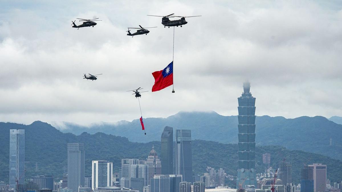 Foto: Elicoptere militare deasupra capitalei taiwaneze Taipei, purtând steagul național, în timpul unui spectacol aerian care marchează inaugurarea mandatului noului președinte Lai Ching-te, 20 mai 2024