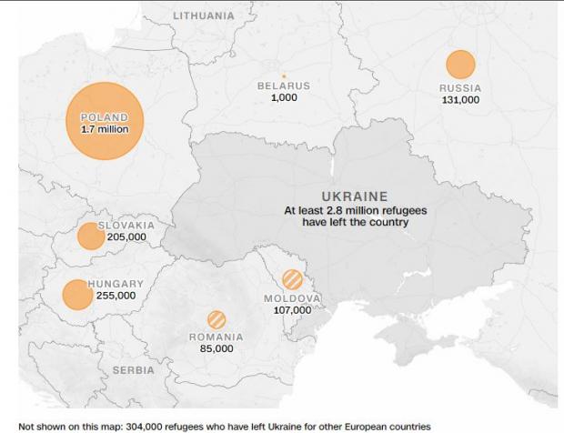 De asemenea, valorile pentru Moldova și România reprezintă numărul total de refugiați aflați în prezent în aceste țări iar datele pentru toate celelalte state reprezintă numărul total de sosiri ale refugiaților, începând cu 24 februarie.