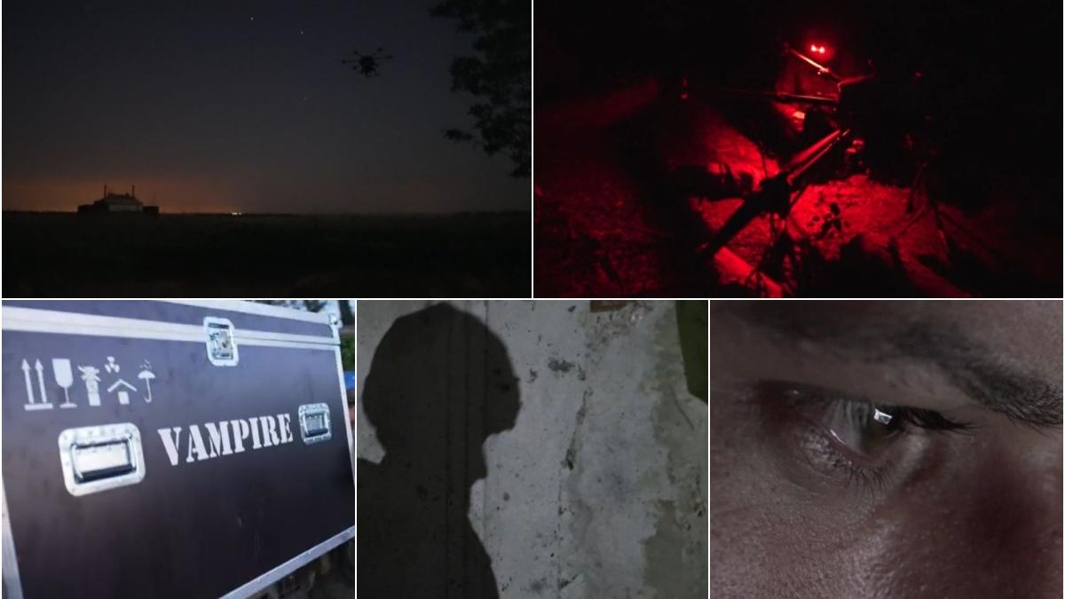 Înapoi în buncăr, pilotul Sașa admiră câmpurile care "curg" sub drona "Vampire", surprinse de camera cu vedere pe timp de noapte a quadricopterului.
