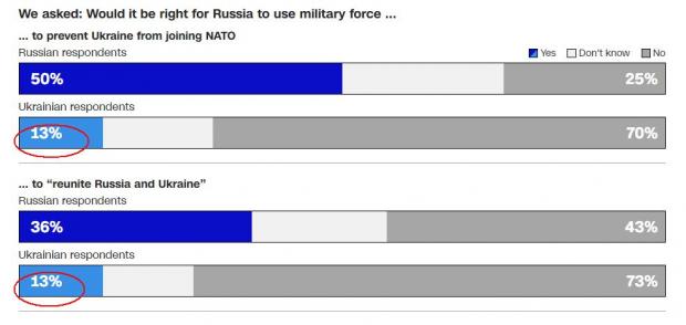 Astfel, unul din doi ruși (50%) susține că ar fi corect ca Rusia să folosească forța pentru a împiedica Ucraina să se alăture Alianței Nord-Atlantice, NATO.