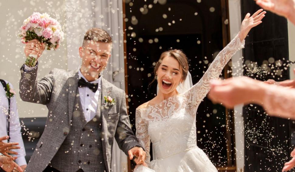 Este ceva normal să vedem rochii de mireasă albe, torturi și decoruri impresionante, smochinguri, limuzine sau invitați în ținute elegante.