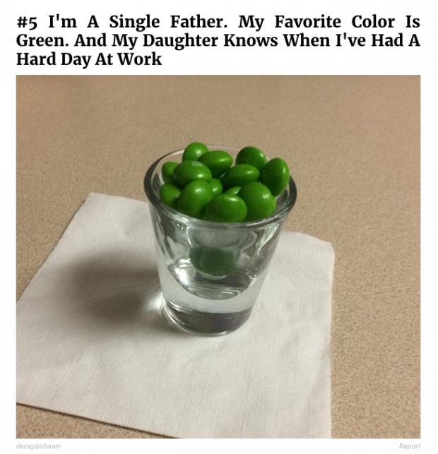 Un tata a ramas de-a dreptul impresionat de ce a facut fiica lui pentru el. Barbatul avusese o zi grea la munca si cand a ajuns acasa era de-a dreptul epuizat. Micuta lui il simtea de fiecare data cand nu era in cea mai buna forma asa ca a decis sa ii faca o surpriza. Fetita stia ca tatalui ii place mult culoarea verde, asa ca a luat mai multe bombonele verzi pe care le-a lasat intr-un pahar pe masa pentru a-si surprinde parintele. Acesta a fost extrem de emotionat de gestul in sine motiv pentru care a urcat poza pe contul de socializare si a primit zeci de like-uri.