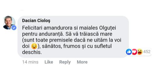 ”Felicitări amândurora și mai ales Olguței pentru anduranță. Să vă trăiască mare (sunt toate premisele dacă ne uităm la voi doi), sănătos, frumos și cu sufletul deschis”, a comentat Cioloș pe rețeaua socială.