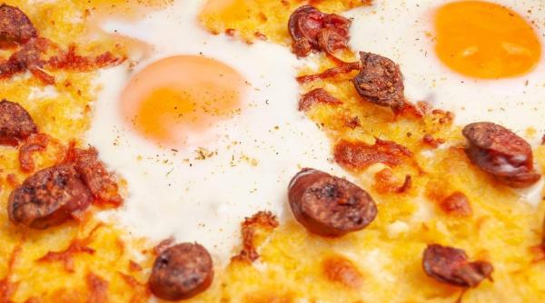 După incorporarea albuşurilor în compoziţia de spanac, se va tapeta o tavă cu hârtie de copt, adăugându-se compoziţia de spanac nivelată uniform.
