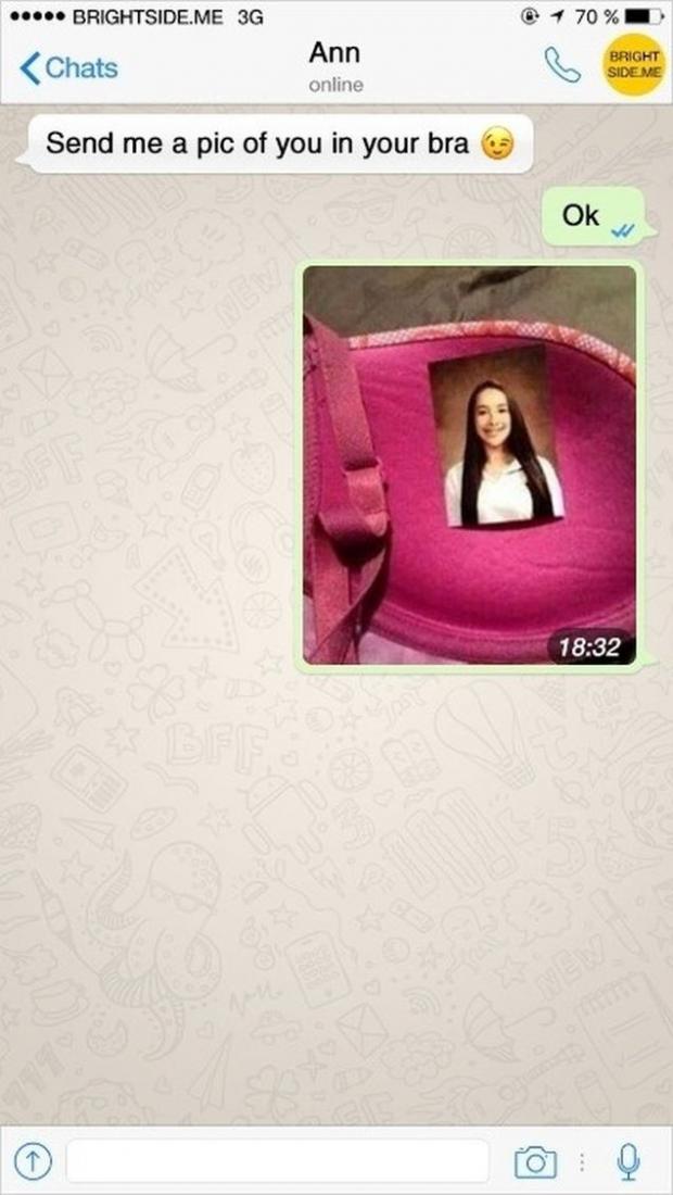 Raspunsul fetei e de zile mari: a urmat, la propriu, indicatiile! A luat un sutien si a pus o poza in el, dupa care a fotografiat toata scena. Baiatul a fost cucerit de umorul acesteia si a postat o parte din conversatia lor pe Facebook, scrie kanald.ro.