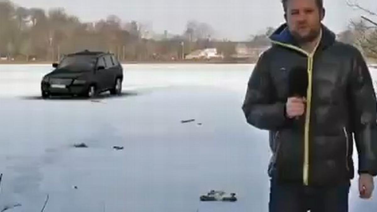 Însă chiar în timpul intervenţiei, stratul de gheaţă de pe lac s-a fisurat, iar maşina a fost înghiţită de ape. Reporterul a fost atât de şocat de întâmplare, încât a uitat complet de colegii din platou sau de oamenii care îl priveau.