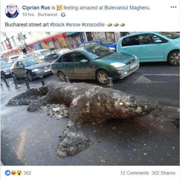 Un crocodil uriaș zăcea întins la umbră. Din fericire, era vorba doar despre o sculptură într-un morman de zăpadă de la ultima ninsoare. Cineva a avut ideea să-i dea o formă... exotică.