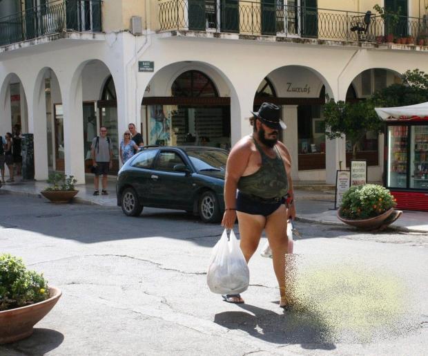 Un bărbat plinuţ a ieşit din casă purtând o ţinută cel puţin bizară: o pereche de pantaloni extrem de scurţi şi un maieu foarte decoltat. Trecătorii nu s-au abţinut să nu se uite la el şi să facă remarci acide pe seama ţinutei acestuia.