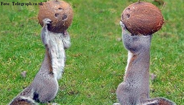 Veveriţele încercau să ajungă la miezul unor nuci de cocos şi, în acest proces, au reuşit să-şi bage capetele in coajă fructului.
