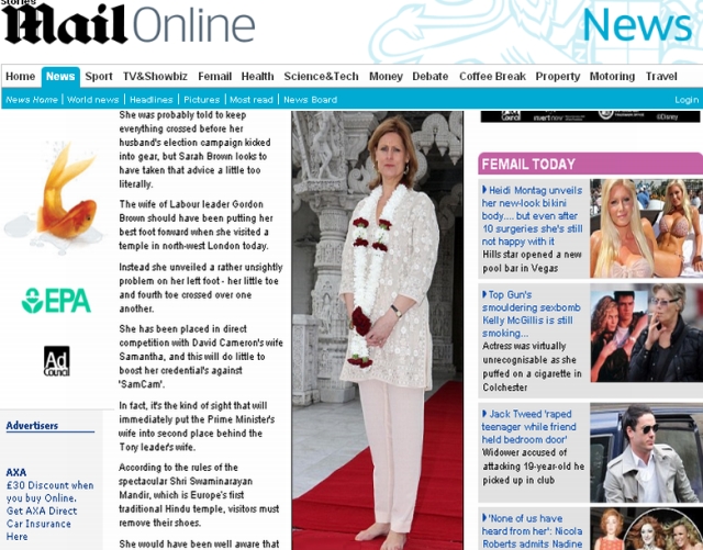 Sarah Brown a vizitat recent templul hindus Shri Swaminarayan Mandir. Ea a fost nevoită să se descalţe, la intrarea în locul de rugăciune.