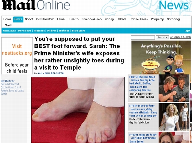 Ceea ce soţia premierului Brown a lăsat la vedere odată cu renunţarea la pantofi nu a fost deloc frumos. Ea a afişat nişte unghii îngălbenite care probabil nu mai ?trecuseră? de mult timp prin mâna unui cosmetician.