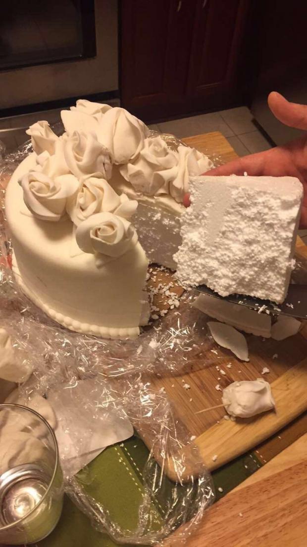 Cei doi au aflat cu stupoare că aceasta este o practică destul de comună la nunți, unde pentru a reduce cheltuielile tortul uriaș este fie în totalitate, fie parțial, umplut cu scârț.
