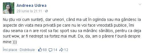 Diva Andreea Udrea are o părere foarte bună despre ea şi spune că şi-a dat seama că n-are rost să facă sport, pentru că deja e waw.