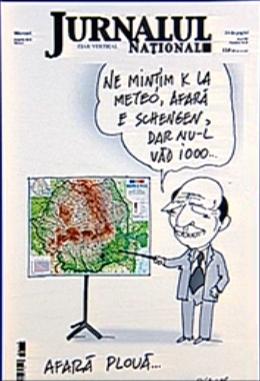 "Ne minţim k la meteo, afară e Schengen, dar nu-l văd iooo...", zice Băsescu la hartă, în caricatura din ziar.