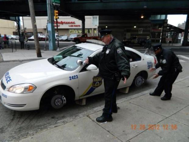Probabil cei doi ofiţeri au mers să îşi cumpere ceva de mâncare, iar când s-au întors au găsit maşina pe butuci, la propriu. Reacţia lor a fost imortalizată de un martor, iar fotografia este de mare succes pe internet: