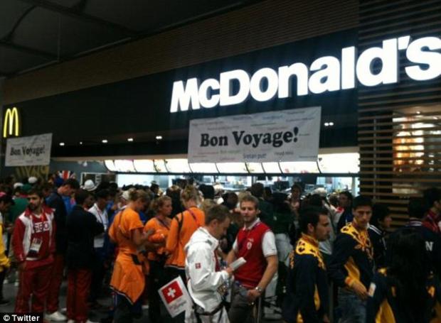 Astfel că pentru a-şi comanda mâncarea preferată, sportivii au stat la cozi uriaşe. Unii sportivi chiar s-au amuzat pe seama mulţimii care stătea la coadă şi au postat pe Twitter mesaje amuzante şi fotografii sugestive de la faţa locului: "Cred că toată lumea va participa la un flash-mob pe cinste aici..."