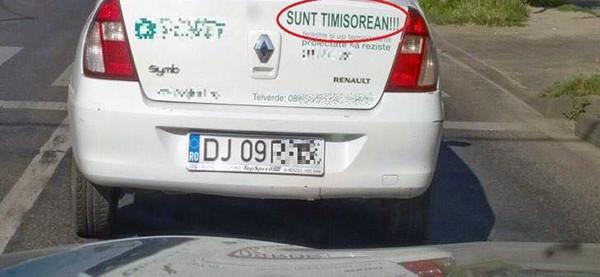”Sunt timișorean” este mesajul transmis de acesta, care speră ca astfel să nu atragă antipatia celor din jur, dat fiind faptul că mașina pe care o conduce, una de firmă, este înmatriculată în județul Dolj.