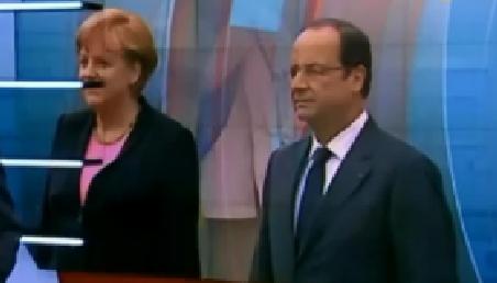 Într-o ediţie a ştirilor olandeze, cancelarul german seamănă extrem de tare cu fostul lider nazist, având buza de sus acoperită de o bucată de plastic sau o greşeală de grafică.