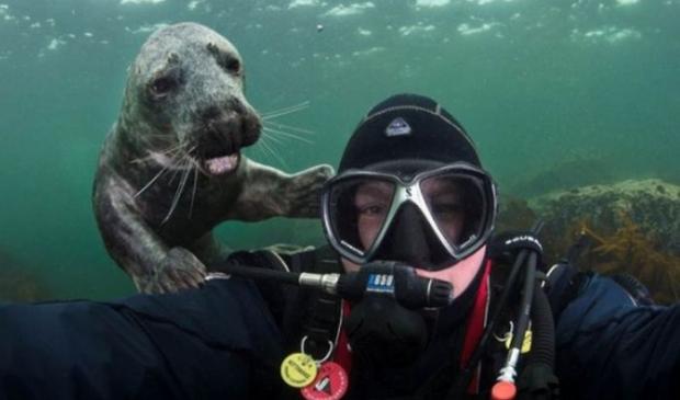 În timp ce făcea o scufundare pe coasta Insulelor Farne, din nord-estul Angliei, biologul a fost „bătut pe umăr” de o focă care, probabil, dorea să apară şi ea în poză.