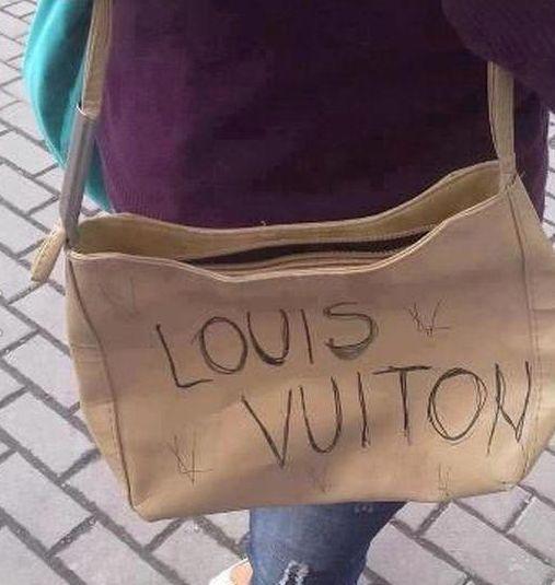 O tânără şi-a inscripţionat, pe o geantă veche, mesajul „Louis Vuiton”.