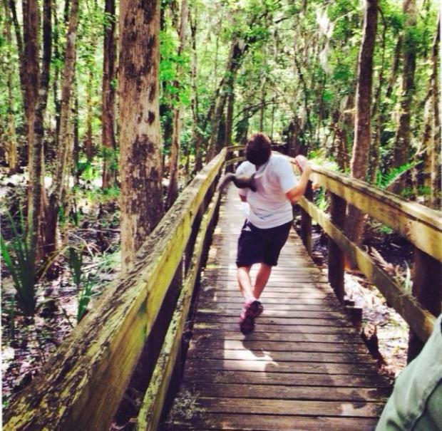 Deşi sunt timide şi sperioase, veveriţele mai au şi câte un reprezentant "cu tupeu". Acest turist, aflat într-o pădure, a ademenit o veveriţă cu nişte nuci şi alune şi s-a bucurat foarte tare când animalul s-a apropiat de el.