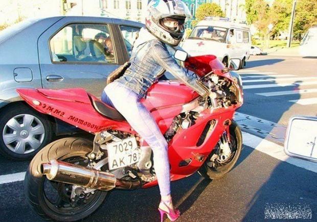 Modul în care se aşează, poziţia corpului în şa, dar şi îmbrăcămintea provocatoare nu lasă loc de glume. Aşa se face că această tânără a ales să meargă cu motocicleta a atras atenţia tuturor şoferilor deoarece în picioare, în loc de cizme din piele, sau o încălţăminte mai comodă, ea purta sandale roz cu toc.