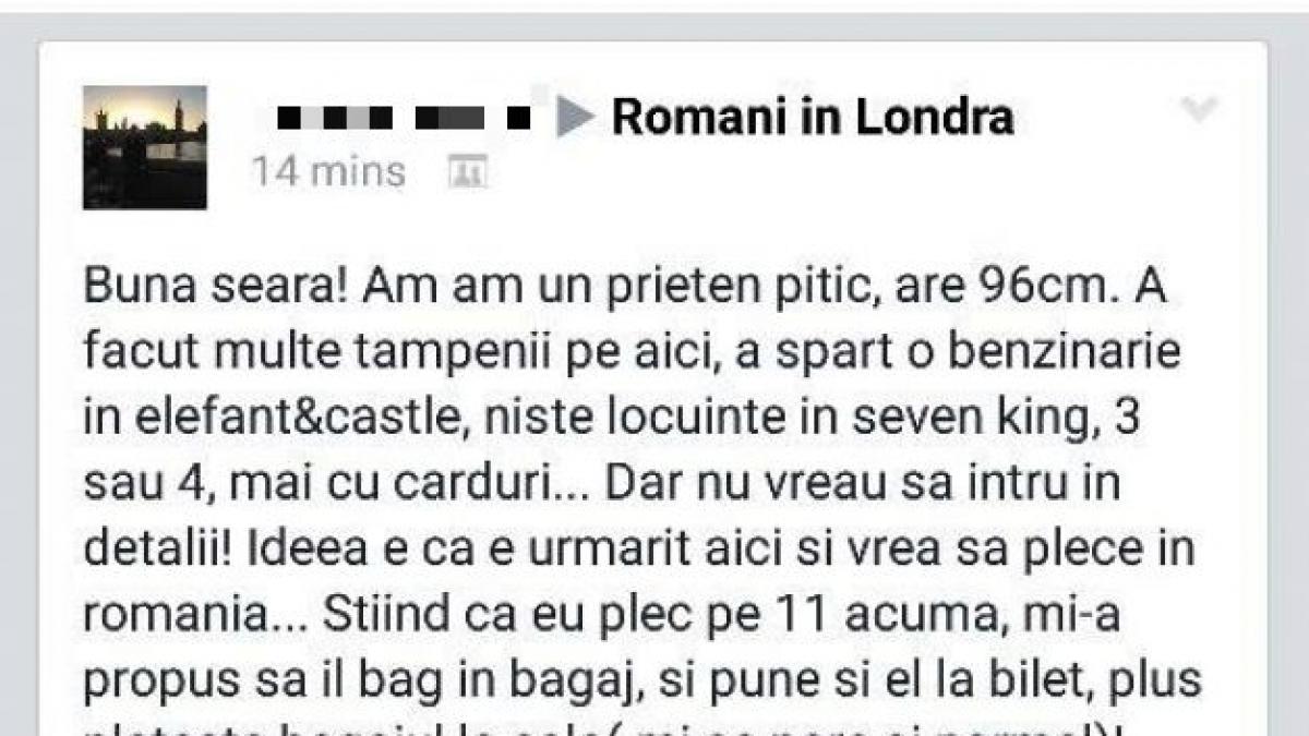 "Bună seara! Am un prieten pitic, are 96 cm. A făcut multe tâmpenii pe aici, a spart o benzinărie în Elefant&Castle, nişte locuinţe în Seven King, 3 sau 4, mai cu carduri... Dar nu vreau să intru în detalii! Ideea e că e urmărit aici şi vrea să plece în România. Ştiind că eu plec pe 11 acuma, mi-a propus să îl bag în bagaj, şi pune şi el la bilet, plus plăteşte bagajul la cală (mi se pare şi normal)! Există riscul să fiu depistat? Şi dacă da... Ce pot păţi? Piticul e major (are 30 de ani)". Cel mai probabil, postarea-viral este o glumă. Tânărul a recidivat pe acelaşi grup pe data de 2 martie, cu o glumă referitoare la un presupus coleg de casă de naţionalitate indian. Iată mai jos, postarea originală a tânărului: