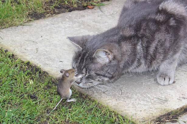Imaginea a fost surprinsă de o englezoaică chiar în curtea casei. Pisica ei Tom, mereu în căutarea hranei, a dat nas în nas cu un şoricel care i-a venit de hac. A înfruntat pisica cum ştia el mai bine şi a reuşit să scape de sub ghearele ei.