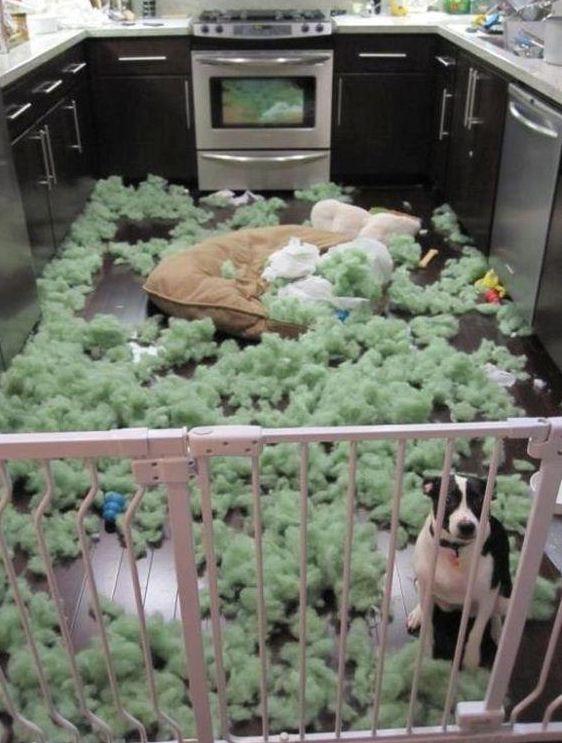 Este şi cazul câinelui din imaginea următoare. Cu toate că a fost lăsat într-un ţarc improvizat în bucătărie unde, teoretic, nu ar fi avut cum să distrugă nimic, patrupedul s-a întrecut pe el şi a reuşit totuşi să o comită şi de data aceasta.