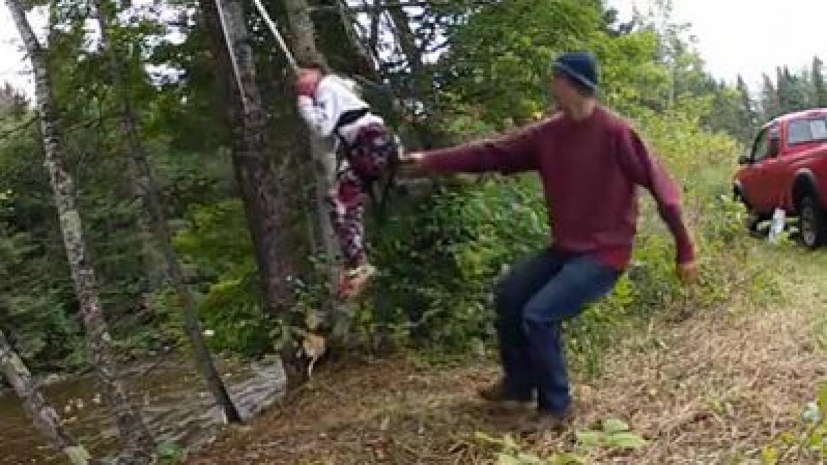 Fata se distrează copios în timp ce tatăl ei o trage, apoi îi dă drumul, zburând astfel printre copaci.