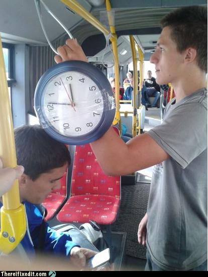 Tânărul din imaginea de mai jos a renunţat la ceasul său de mână, şi în locul aceluia, şi-a accesorizat ţinuta cu un ceas de perete. Toată lumea din autobuz s-a amuzat pe seama lui şi i-a fotografiat apariţia ciudată.