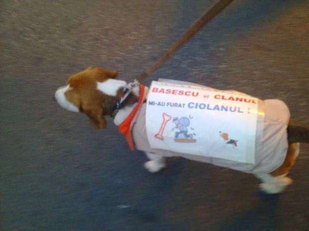Pentru că şi animalele suferă atunci când stăpânii lor sunt nemulţumiţi, un căţel scos la plimbare prin ploaie, a fost purtătorul unui mesaj foarte simpatic: "Băsescu şi clanul mi-au furat ciolanul"