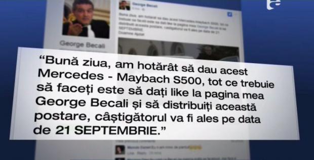 Mii de internauţi au crezut că Dumnezeu le pune mâna în cap, când au citit că George Becali îşi dă Maybachul de pomană. Cu un like şi un share la presupusa pagină de facebook a latifundiarului, oricine a putut să participe la pomana online.