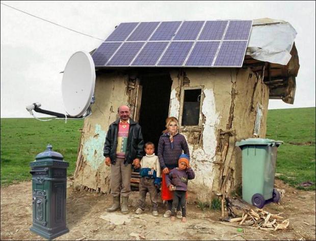 Observaţi însă că "familia" din imagini are totuşi coliba dotată cu panouri solare, antenă parabolică şi tomberon de gunoi.